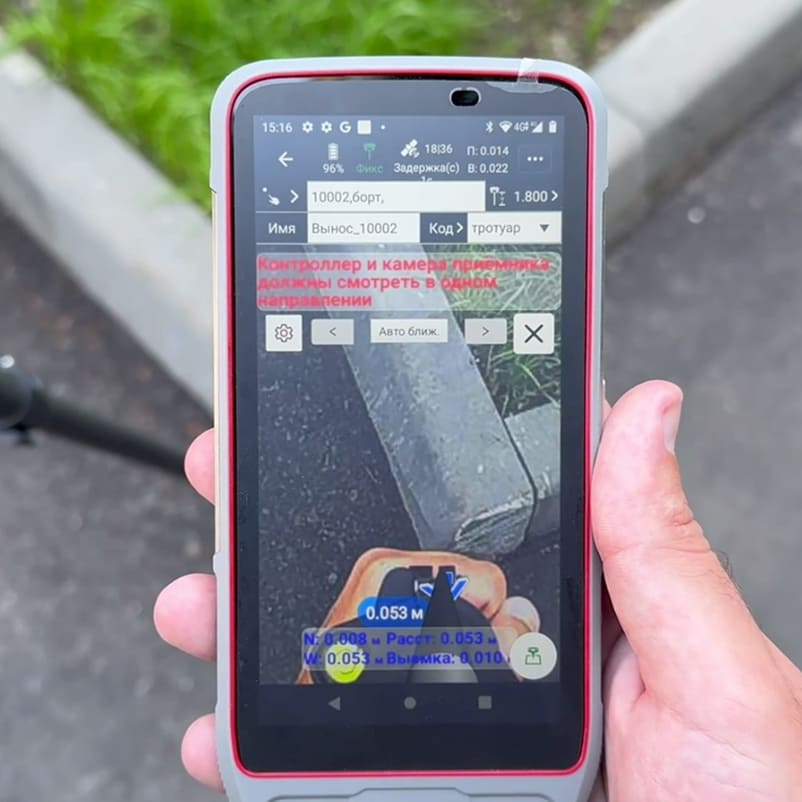 Вы можете делать вынос точек с эффектом дополненной реальности для наглядного отображения точек на местности. Видеовынос начинает работать за 50 метров от точки и с помощью камер приёмника показывает место, где точка будет находиться на местности.